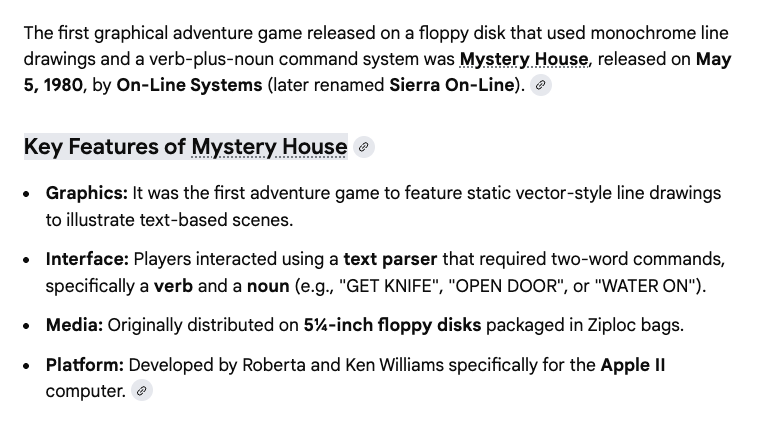 We got every game in my family, every new system including a self contained Astroids vetrex (note to self… look that up… ) game where we played and played in our early years into our teens. A Mac with floppy disks containing games that only used still screen shots to move between the transitions literally captured our attention for hours. There was no mouse, only a keyboard to type in a verb and then a noun. Ie: Move Rock > then it would take you to another still screen shot, with lines only as the graphic, across the window. So the entire game fit onto 1.2 MB which is insane in today’s thinking.